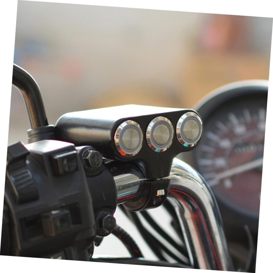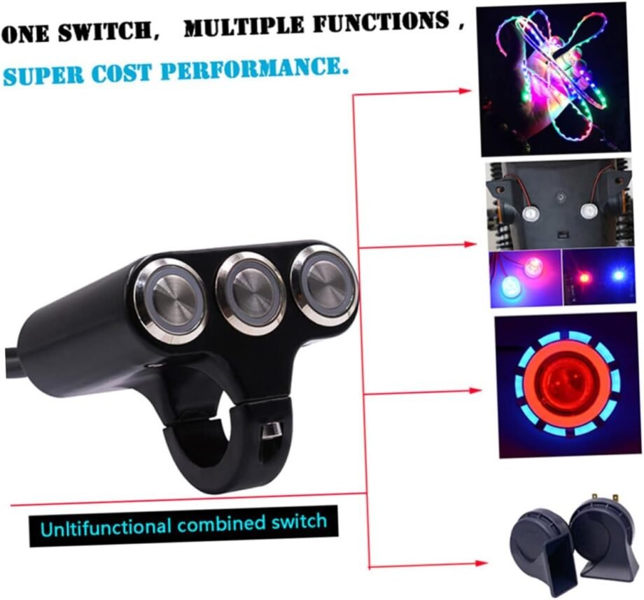Botonera triple con dos interruptores y un pulsador, diseñada para patinetes eléctricos y bicicletas. Incluye conector SM, facilitando la instalación y el control de diversas funciones del vehículo.
