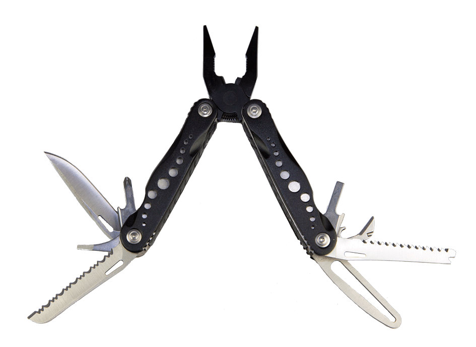 Alicate multiherramientas con 19 herramientas incluyendo navaja y destornillador de 9 puntas.